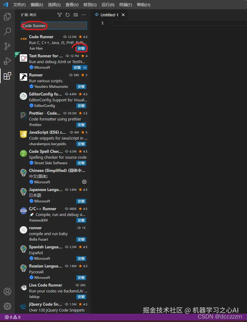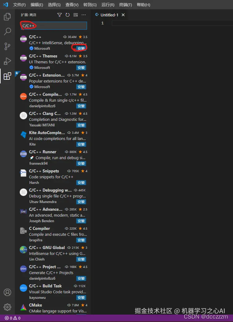 此外,还需安装两个扩展,分别是“C/C++”和“Code Runner”。同上搜索安装即可。