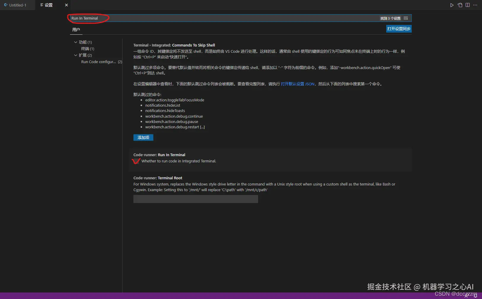 搜索“Run In Terminal”并勾选“Run In Terminal”设置。这样你在运行代码时才能输入。