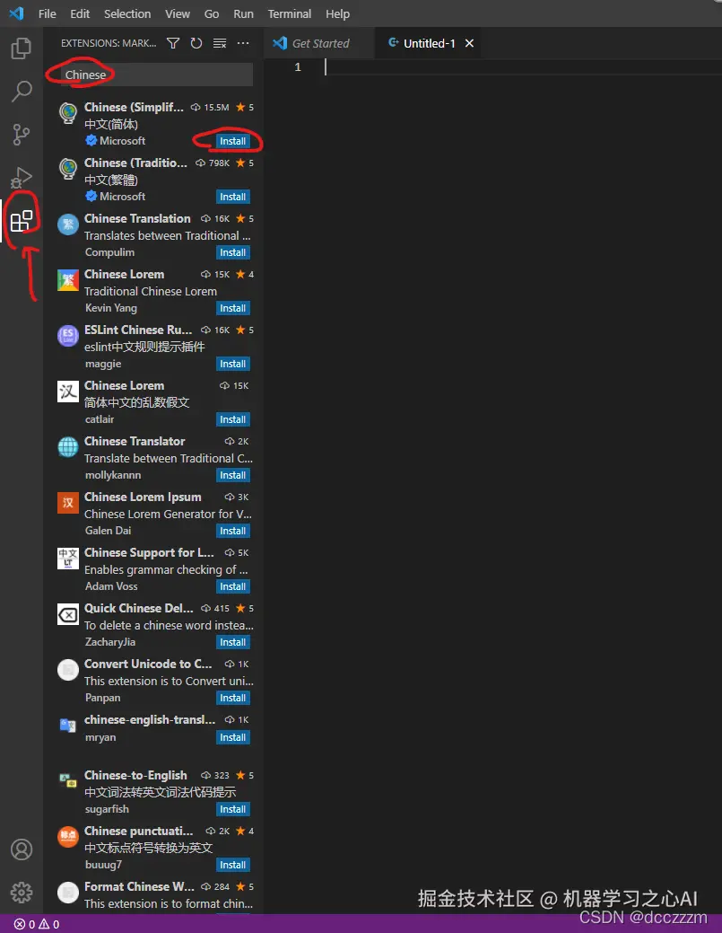 在左边的工具栏点击扩展(Ctrl + Shift + X),搜索框中搜索“Chinese”,选择第一个“中文(简体)”,点击“安装”。