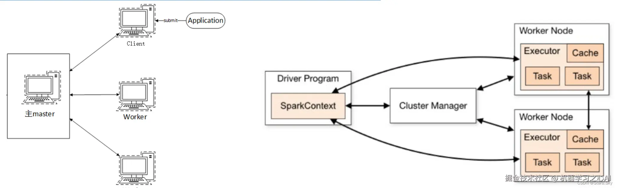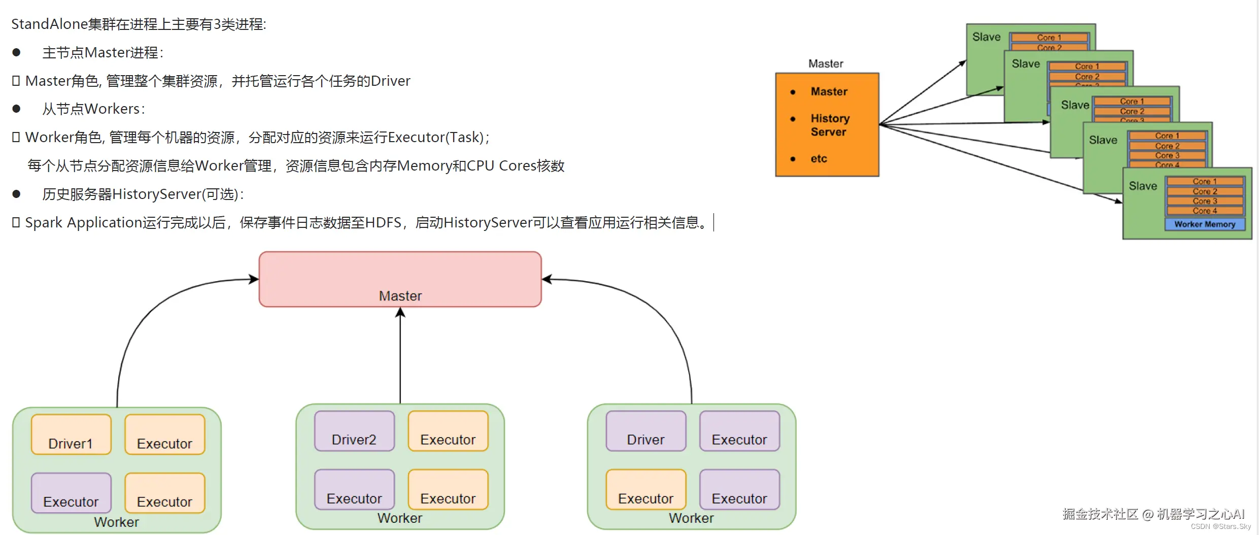 - Driver 和 Executor 运行于 Worker 进程内,由 Worker 提供资源供给它们运行。