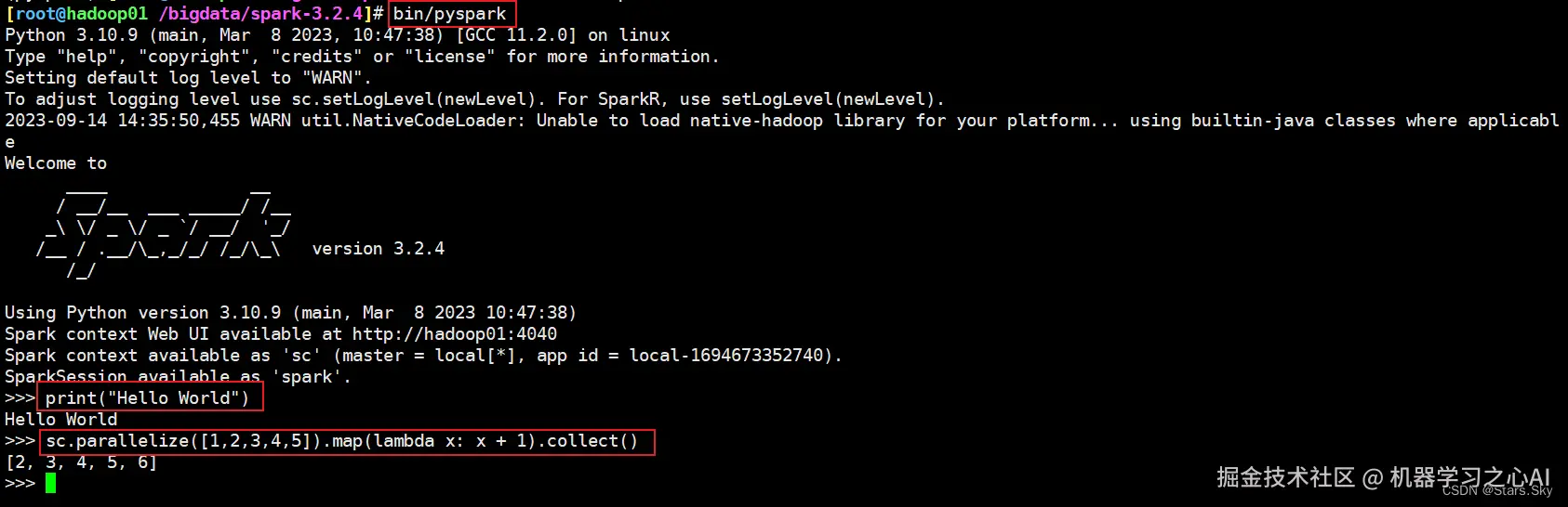 [root@hadoop01 /bigdata/spark-3.2.4]# bin/pyspark