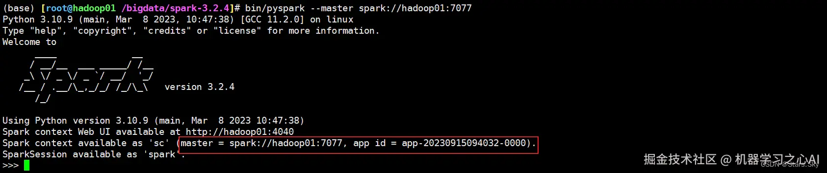(pyspark) [root@hadoop01 /bigdata/spark-3.2.4]# bin/pyspark --master spark://hadoop01:7077