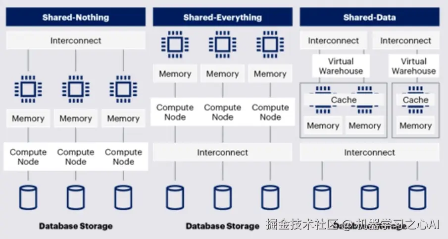 大数据平台的数仓体系最初由数据库发展而来,Shared-Nothing(也称MPP)架构在很长一段时间成为主流。随云原生能力增强,Snowflake为代表的Shared-Data逐渐发展起来。而基于DFS和MapReduce原理的大数据体系,设计之初就是Shared-Everything架构。