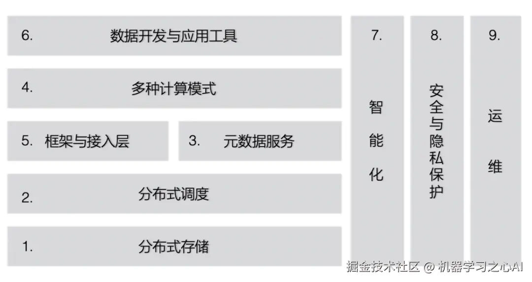 在前文(#1.1)介绍的Shared-Nothing、Shared-Data、Shared-Everything 三种架构中,笔者经历过的两套体系(微软Cosmos/Scope体系,和阿里云MaxCompute)均为Shared-Everything架构,因此笔者主要从Shared-Everything架构角度,将大数据领域分成6个叠加的子领域、3个横向领域,共9个领域,具体如下图。
