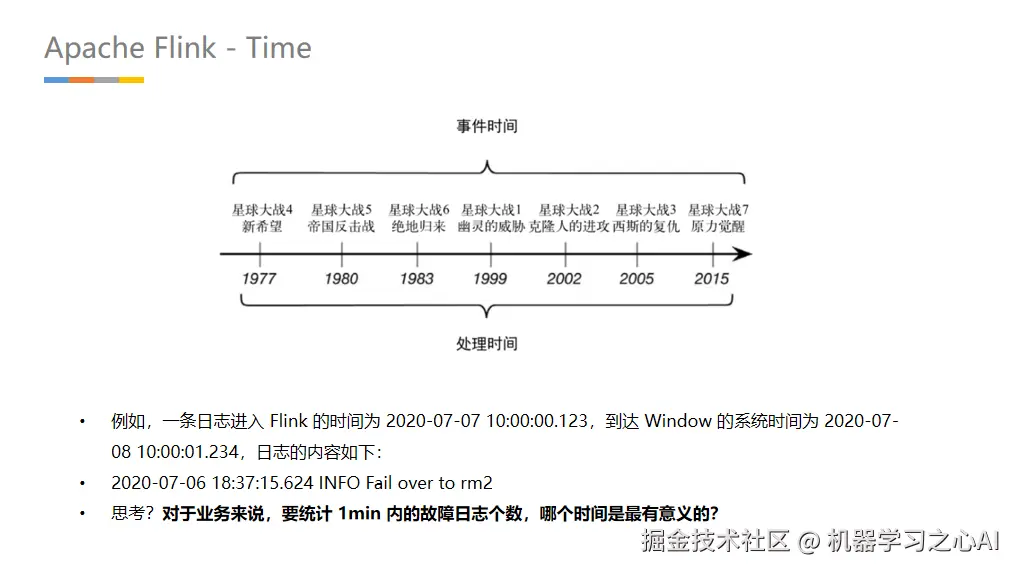 Time,分为Event time、Ingestion time、Processing time,Flink 的无限数据流是一个持续的过程,时间是我们判断业务状态是否滞后,数据处理是否及时的重要依据。