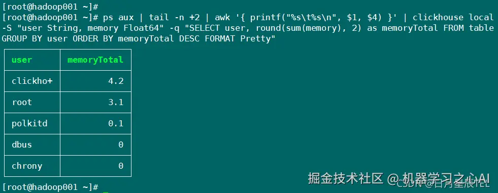 ps aux | tail -n +2 | awk '{ printf("%s\t%s\n", 4) }' | clickhouse local -S "user String, memory Float64" -q "SELECT user, round(sum(memory), 2) as memoryTotal FROM table GROUP BY user ORDER BY memoryTotal DESC FORMAT Pretty"