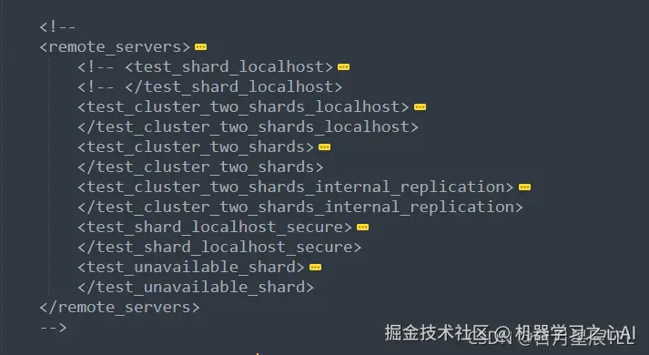 ①修改 /etc/clickhouse-server/config.xml 文件,把 remote_servers 标签的默认配置注释掉