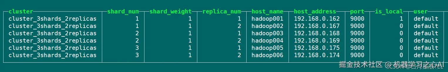 | hadoop004 | √ | shard01 | replica_01_01 | |