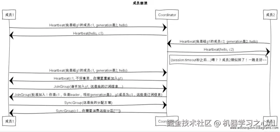 **组成员崩溃和组成员主动离开是两个不同的场景。**因为在崩溃时成员并不会主动地告知coordinator此事,coordinator有可能需要一个完整的session.timeout周期(心跳周期)才能检测到这种崩溃,这必然会造成consumer的滞后。可以说离开组是主动地发起rebalance;而崩溃则是被动地发起rebalance。