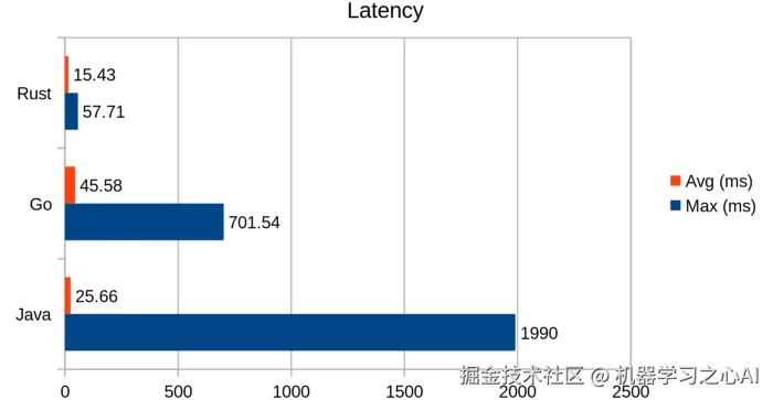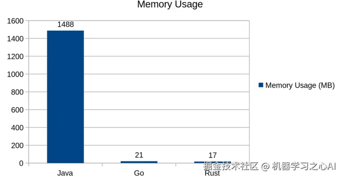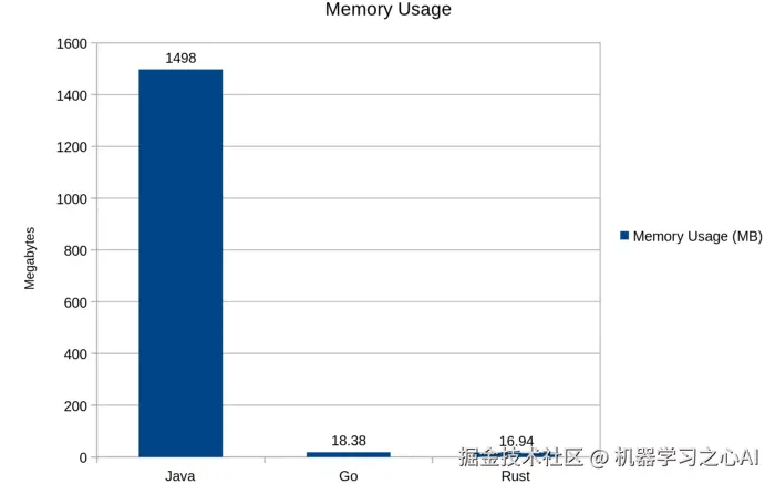 在整个测试过程中,Java版本的应用比Go或Rust对应的应用消耗了更多的内存,在数量级上,前两次测试中,Java使用的内存大约多出8000%。这意味着对于现实世界的应用来说,Java应用的运营成本更高。