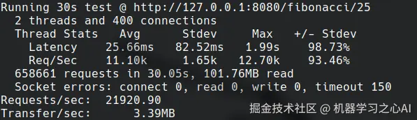 在/fibonacci端点测试中,Java实现是唯一一个出现150次请求超时的,wrk输出如下所示: