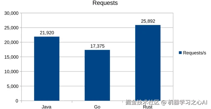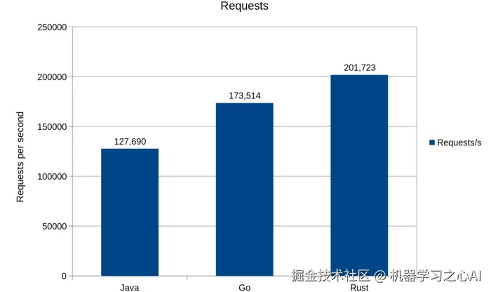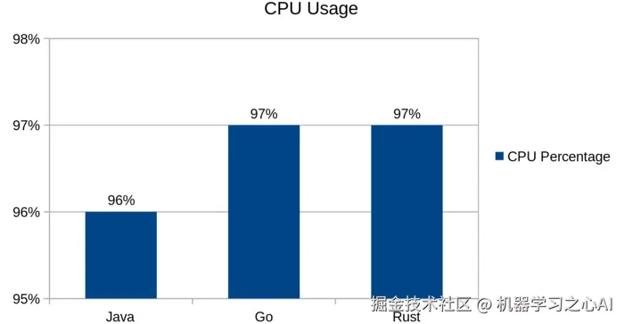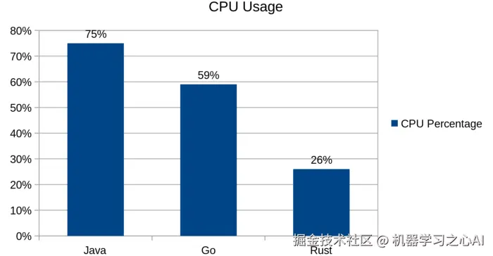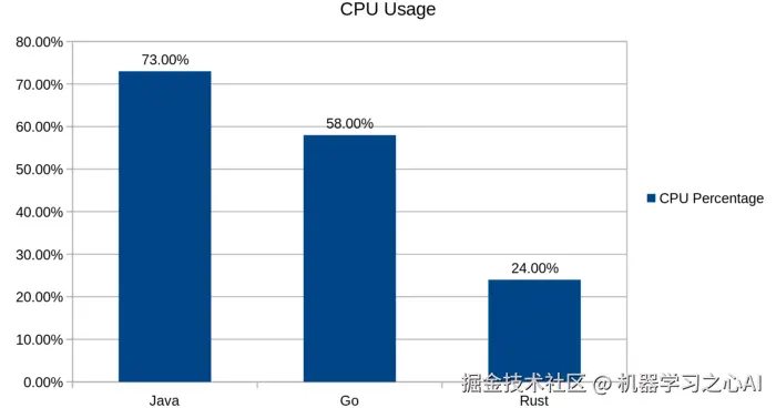 在前两项测试中,Go应用程序的CPU使用量比Java少了20%左右,而服务的请求却多了38%。另一方面,Rust版本的CPU使用量比Go少57%,而服务的请求量却多13%。