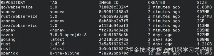 我使用的Docker镜像命名约定是{lang}/webservice。Java、Go和Rust版本的应用程序的镜像大小分别是113MB、8.68MB和4.24 MB。