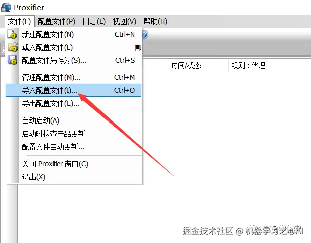 然后点击 Proxifier 左上角的“文件”–>“导入配置文件”,选择解压出的 Default.ppx 文件即可导入成功