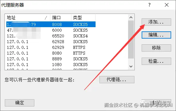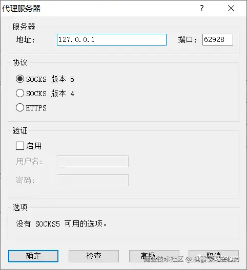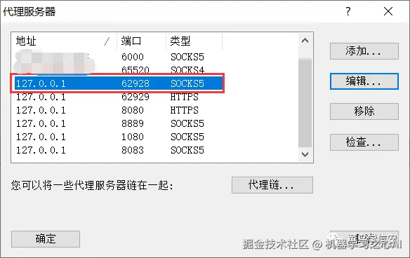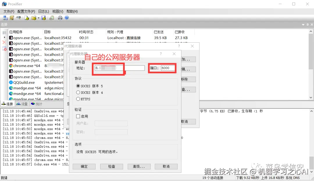 找到代理的服务端的IP和端口(本地代理服务就是 127.0.0.1)并填写和选择对应代理协议,如下图所示: