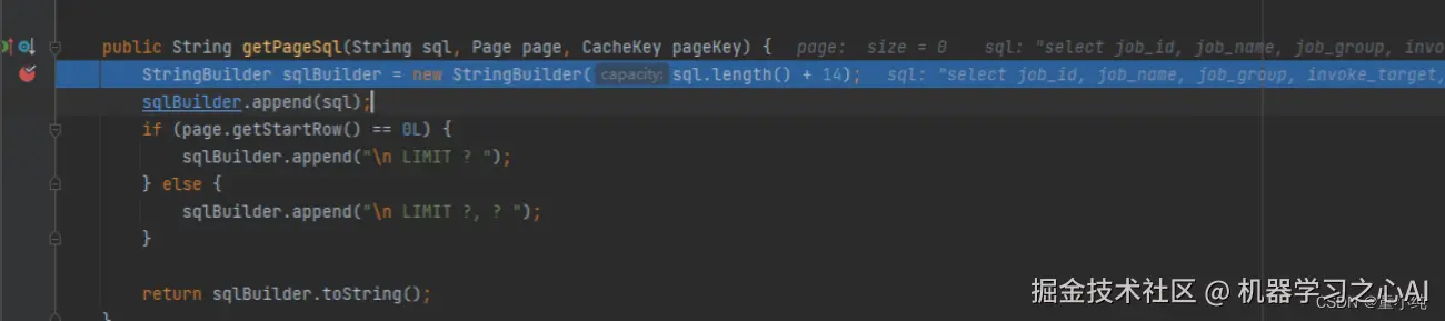 这里的写法也很值得学习,首先是使用StringBuilder加速字符串拼接速度;其次,是在拼接前首先开辟充足的空间new StringBulder(sql.length() + 14)以免在StringBuilder拼接过程中再次分配空间浪费时间。