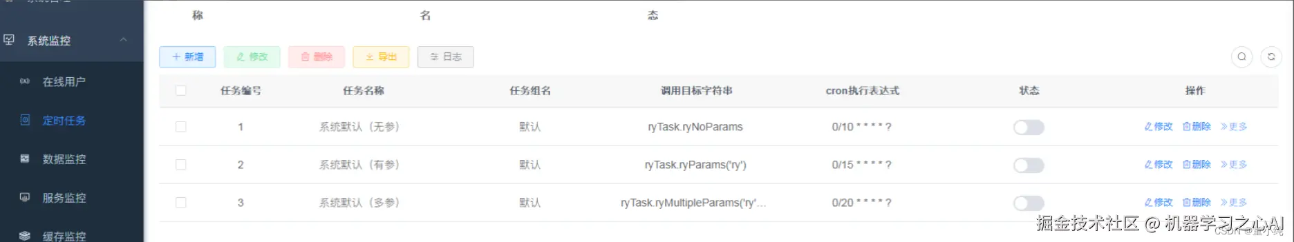 以若依系统中的中某个页面,如“系统监控->定时任务”存在分页,我们以此为例。