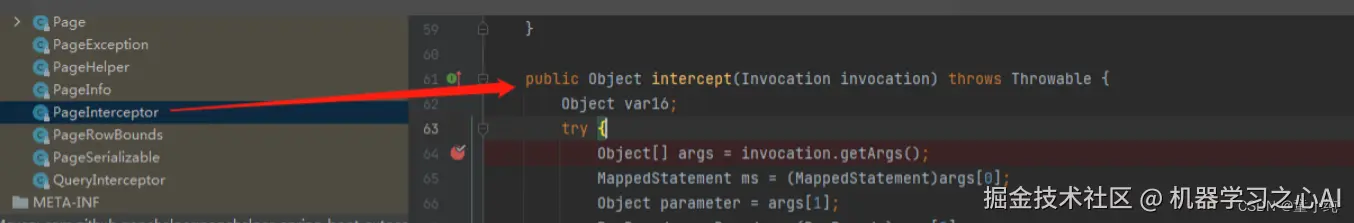 我们首先在PageInterceptor拦截器入口处打一个断点。: