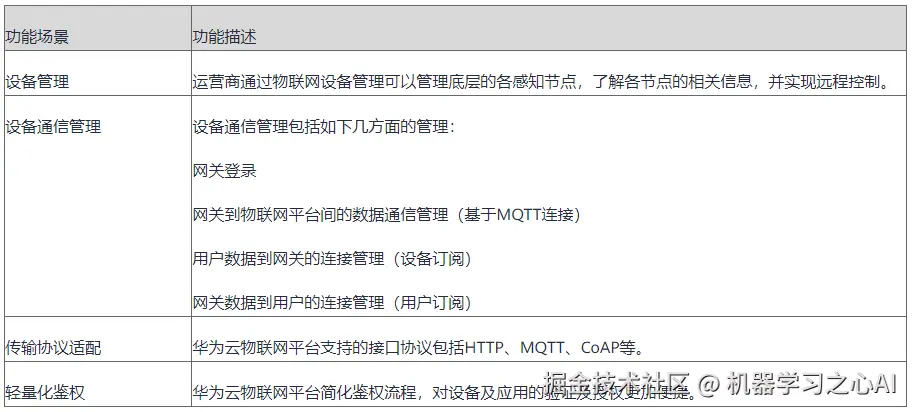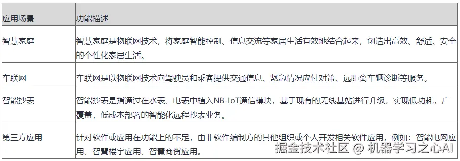 **应用层:**华为云物联网平台支持多种OpenAPI形式,支持预集成多个行业应用,主要包括智慧家庭、车联网、智能抄表和第三方应用等。下表介绍应用场景。