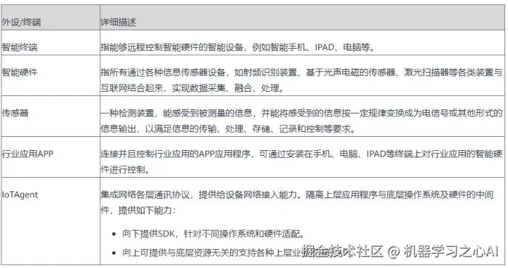 **终端层:**物联网平台提供标准的IoTAgent,能够快速适配OS和各类厂商的智能终端,同时预集成高价值行业应用。这些终端设备如下表。