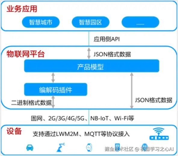 **物联网平台:**作为连接业务应用和设备的中间层,屏蔽了各种复杂的设备接口,实现设备的快速接入;同时提供强大的开放能力,支撑行业用户快速构建各种物联网业务应用。