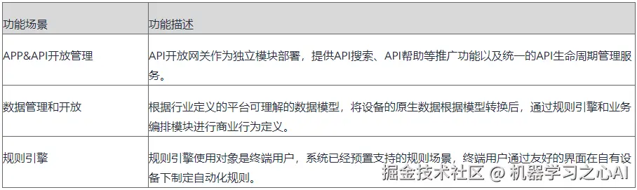 **业务使能层:**华为云物联网平台解决方案业务使能层主要提供API开放网关、数据管理、规则引擎等功能。下表介绍业务使能层的功能场景及描述。