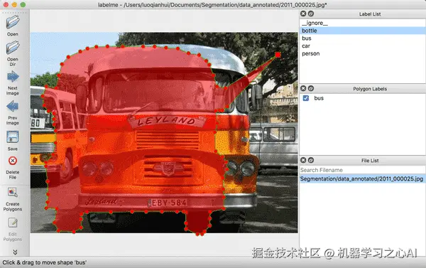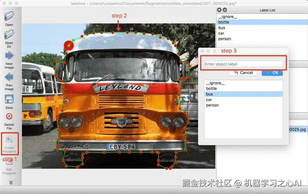 (1) 点击OpenDir打开待标注图片所在目录,点击Create Polygons,沿着目标的边缘画多边形,完成后输入目标的类别。在标注过程中,如果某个点画错了,可以按撤销快捷键可撤销该点。Mac下的撤销快捷键为command+Z。