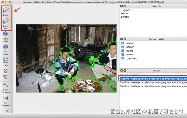 终端输入labelme会出现LableMe的交互界面,点击OpenDir打开<path/to/labelme>/examples/semantic_segmentation/data_annotated,其中<path/to/labelme>为克隆下来的labelme的路径,打开后示意的是语义分割的真值标注。