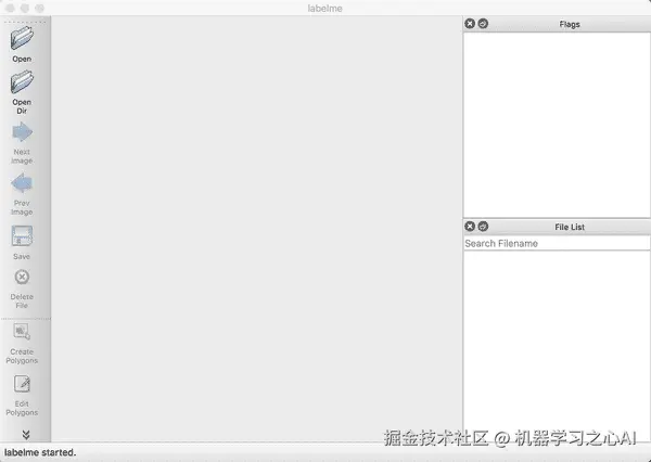 打开终端输入labelme会出现LableMe的交互界面,可以先预览LabelMe给出的已标注好的图片,再开始标注自定义数据集。