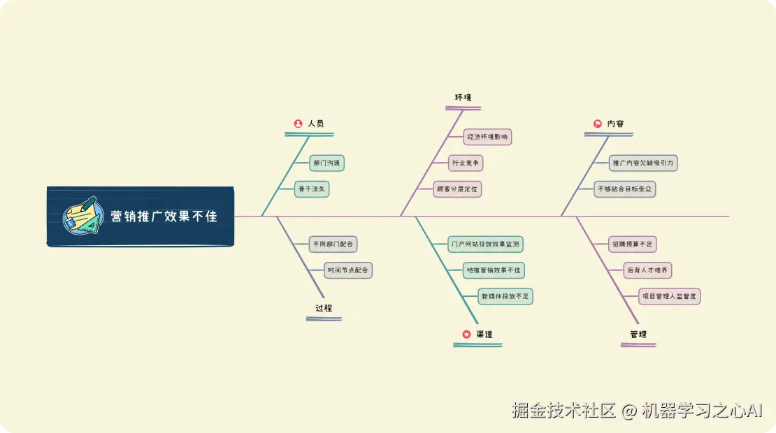 通过鱼骨图,我们来复盘和分析营销推广广告效果不佳的原因,可以从人员、环境、内容、过程、渠道、管理等6个方面来进行深入的分析,最后分析出具体的原因以及找出针对性的做法。xmind软件也是项目经理手里的必备利器,用过的都说好。