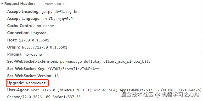 Upgrade首部,用来把当前的HTTP请求升级到WebSocket协议,这是HTTP协议本身的内容,是为了扩展支持其他的通讯协议。 如果服务器支持新的协议,则必须返回101.