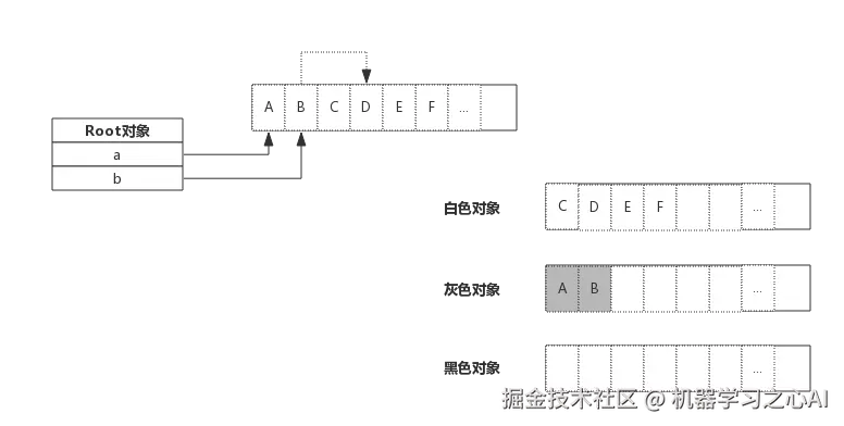 例如开始扫描时发现根对象A和B, B拥有C的指针。