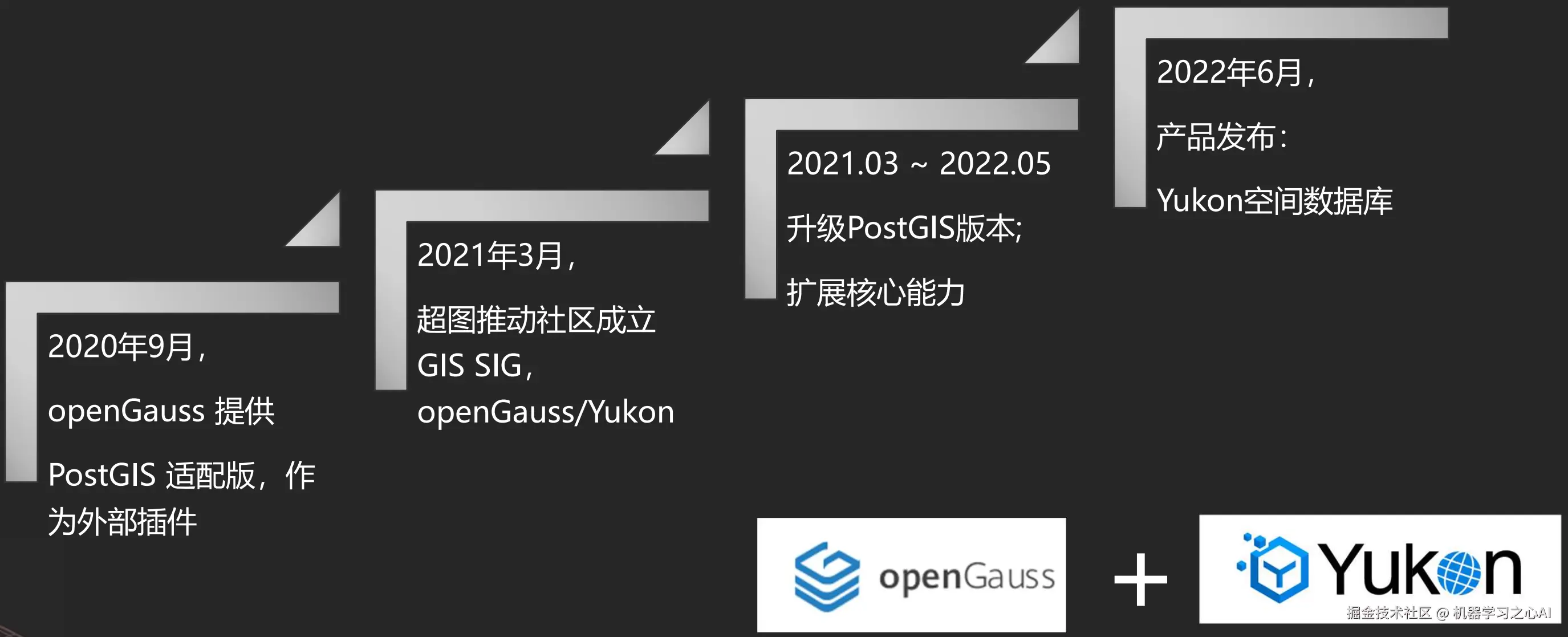 YuKon(禹贡)是基于华为openGauss数据库的,在2020年9月,openGauss提供了PostGIS的适配,作为空间数据库管理的外部插件。2021年3月,在超图的推动下,社区成立了GIS SIG,openGauss/YuKon。从2021年3月到2022年5月,一直在升级PostGIS版本,扩展空间管理的核心能力。2022年6月,超图集团在第五届GIS软件技术大会正式发布YuKon空间数据库。YuKon开源库地址:openGauss/Yukon