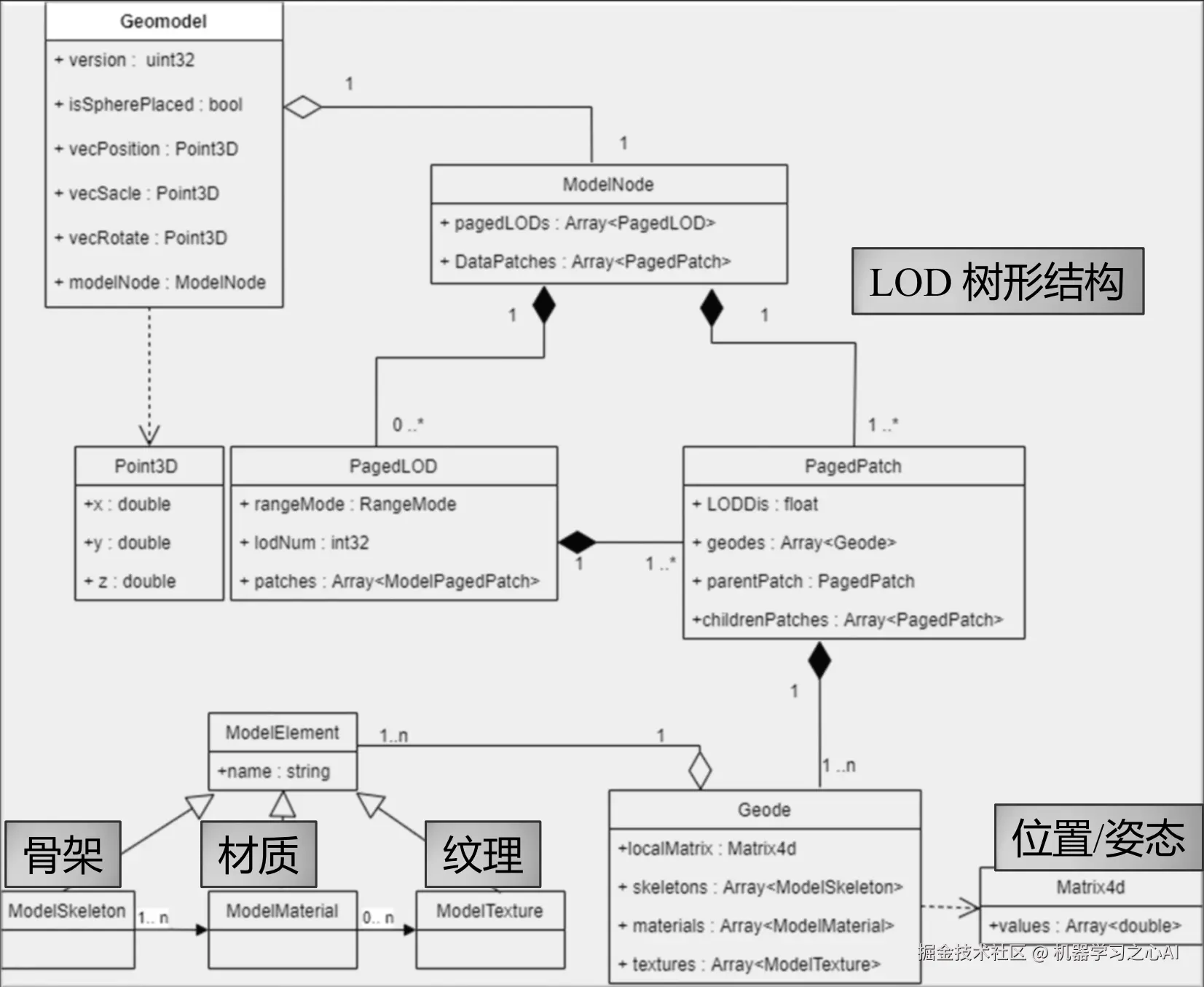 三维模型对象存储为GeoModel类型,由带局部坐标系的模型对象(ModelNode)及其放置的位置、姿态等信息组成,对象组织结构见下图: