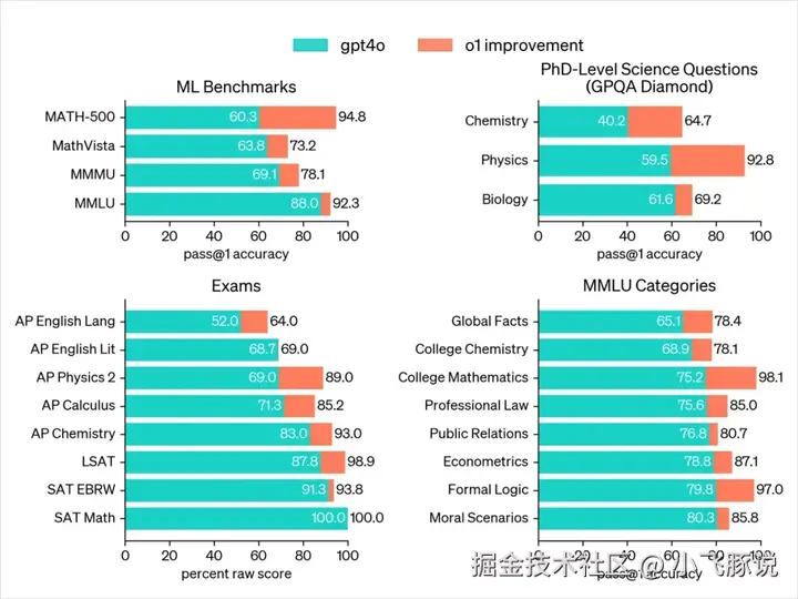 在博士级科学问题的 GPQA Diamond 评测中,GPT4o 的正确率为 56.1%,人类专家则为 69.7%,而 o1 则显著提升至 78%。