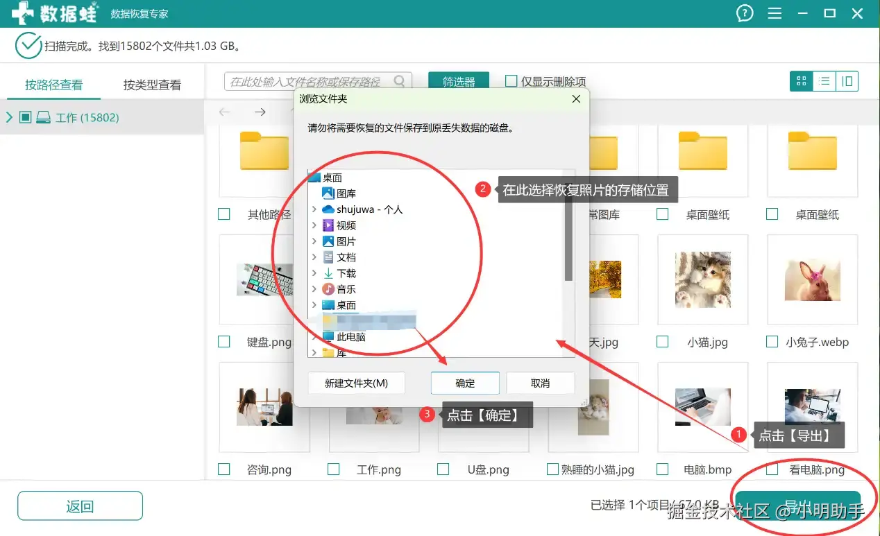 步骤3: 选中照片后点击右下方的【导出】按钮,按下后还会弹出一个窗口,在上面选择恢复照片的除扫描位置之外的存储位置,选择完毕后点击【确定】。