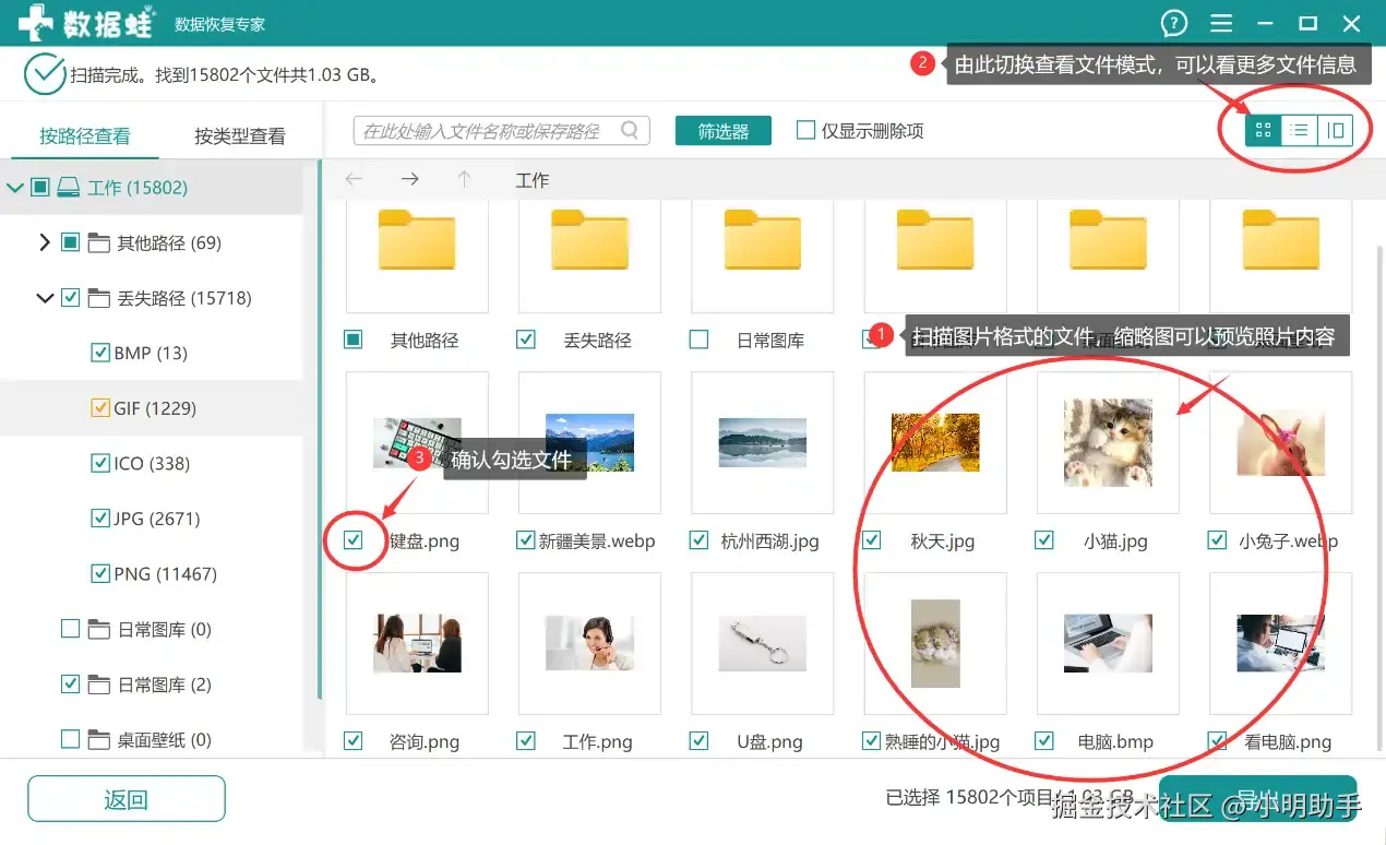 步骤2: 耐心等待扫描结束后,选择需要进行恢复的照片。可以通过切换扫描文件的查看方式获取更多的扫描照片的信息。选中后,点击照片,空格出现“√”图案则表示勾选成功。