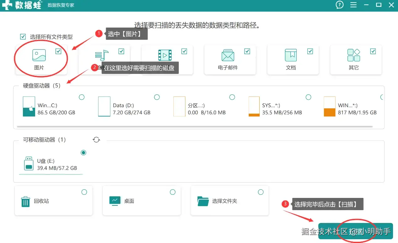 这款误删照片恢复软件,只需要按照以下三步就能完成整个照片恢复流程: