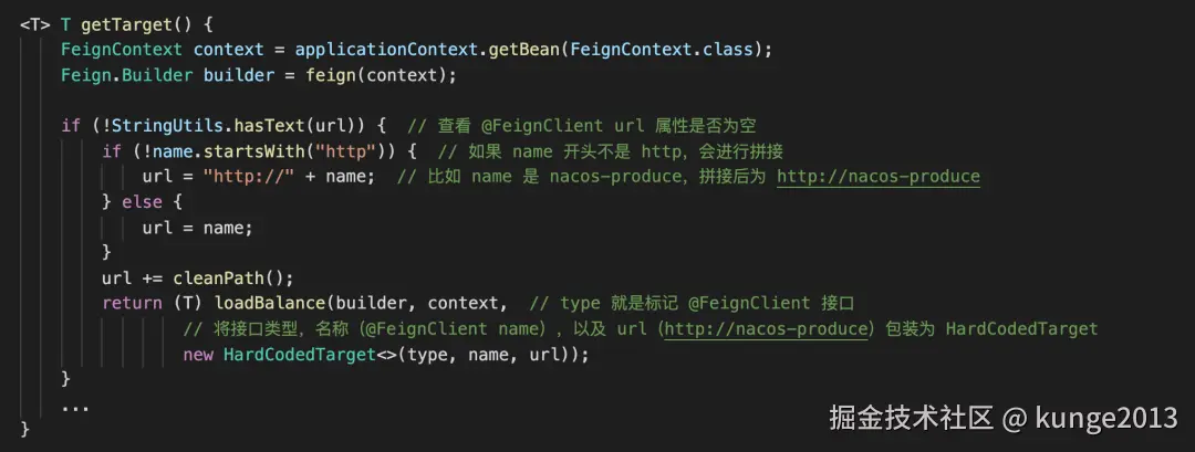 因为我们在 @FeignClient 注解是使用 name 而不是 url,所以会执行负载均衡策略的分支