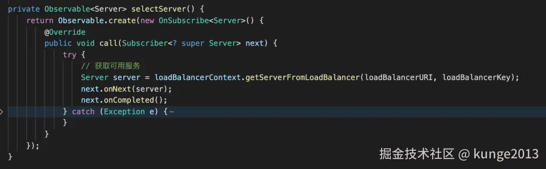 执行远端调用逻辑中使用到了 Rxjava (响应式编程) ,可以看到通过底层获取 server 后将服务名称转变为 ip+port 的方式