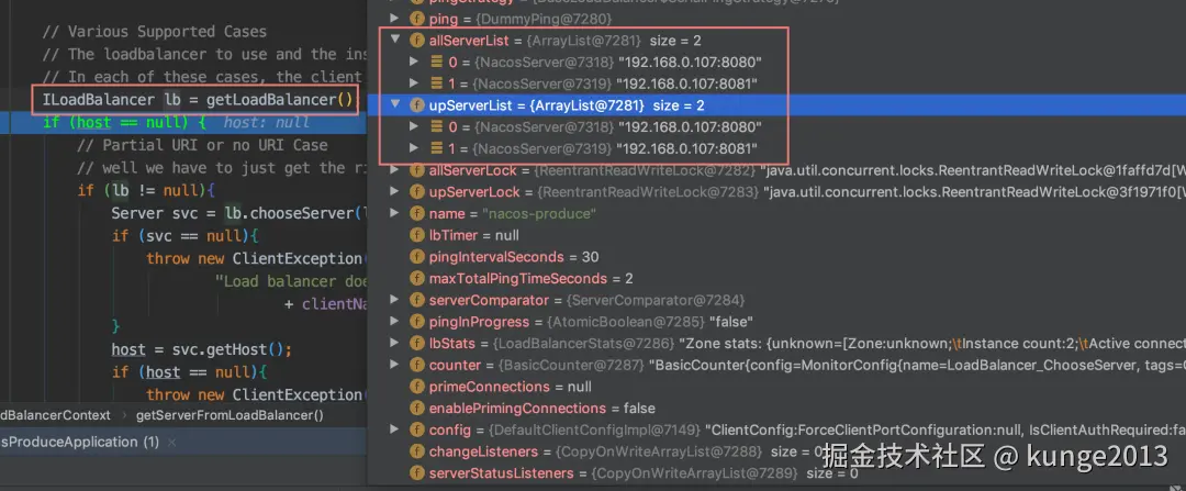 我们在 Nacos 上注册了两个服务,端口号 8080、8081。在获取负载均衡器时就可以获取服务集合