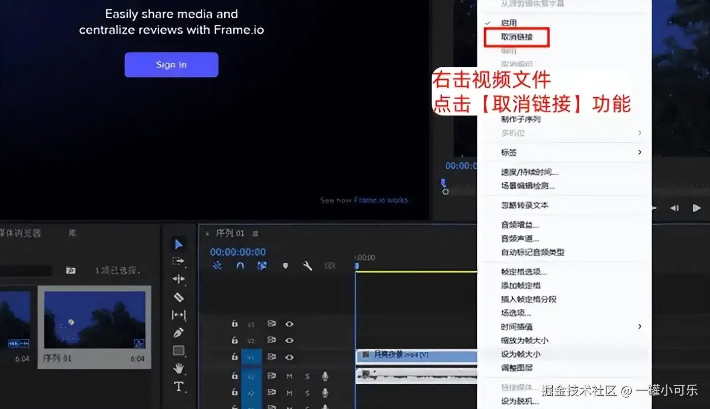 步骤2:在视频的编辑区域中,右击视频文件,点击 【取消链接】 功能,即可提取视频中的音频。