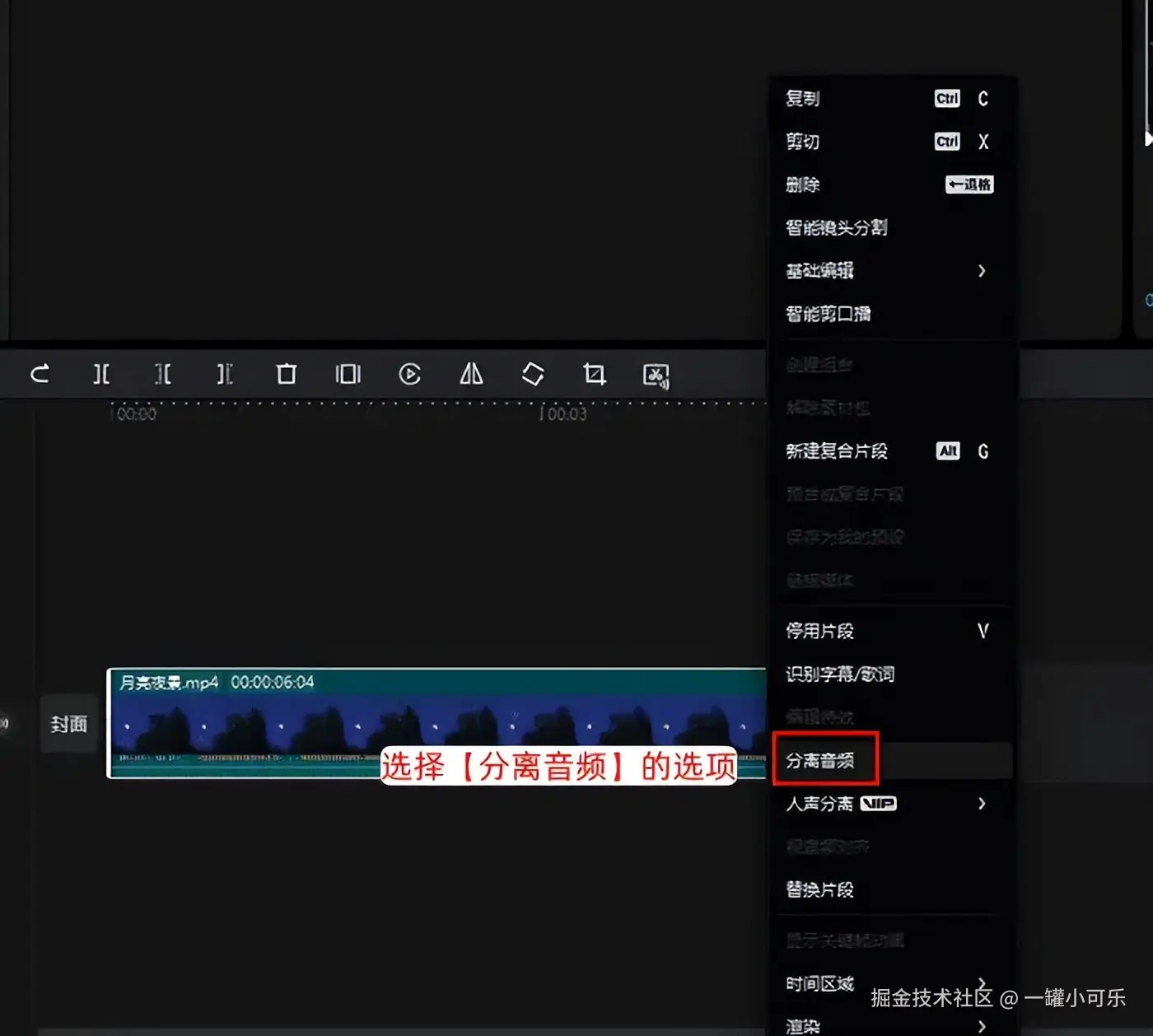 步骤1:导入需要提取音频的视频,并将其添加至视频编辑区域,右击视频项,选择【分离音频】的选项。