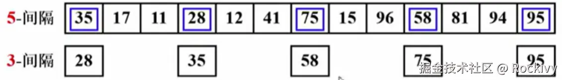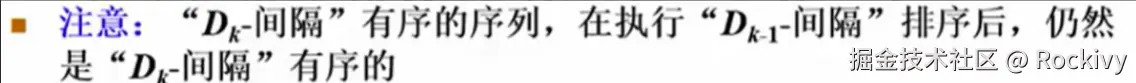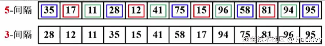 重要性质:3-间隔有序的序列还保持了前面5-间隔有序的这个性质(没有把上一步的结果变坏)