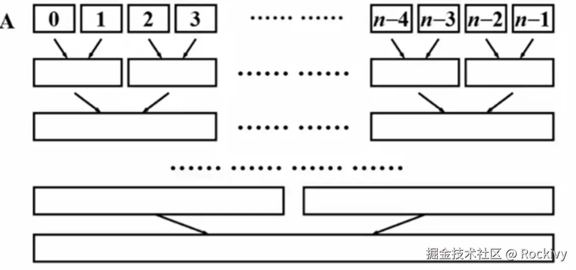 归并的时间复杂度为 O(N),因为每次都需要将 N 个元素进行比较并合并。