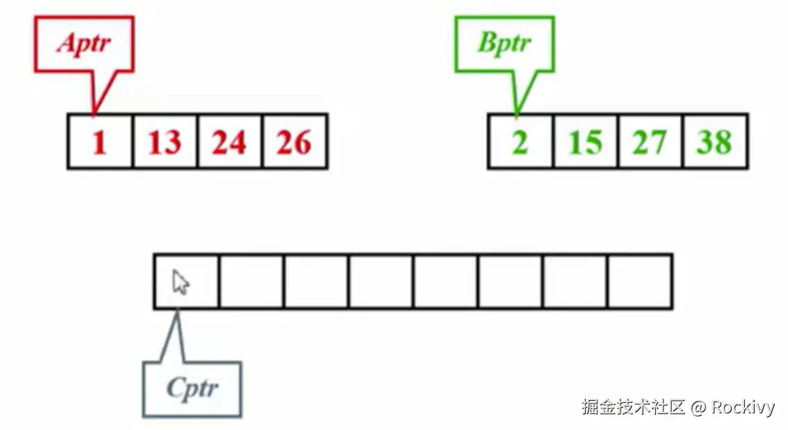上方图中红色跟绿色的指针指向的位置进行比大小,小的填入下方的空位置中,红绿色其他一方填入数值后指针就往后挪一位,然后继续红绿色指针所指位置对比大小,直到下方空位置填满