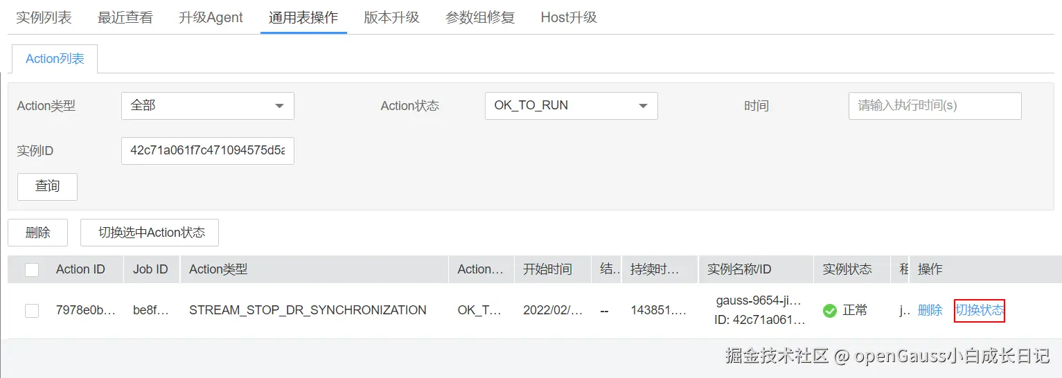 进入“实例运维 > 通用表操作”页面,根据实例ID搜索实例Action。