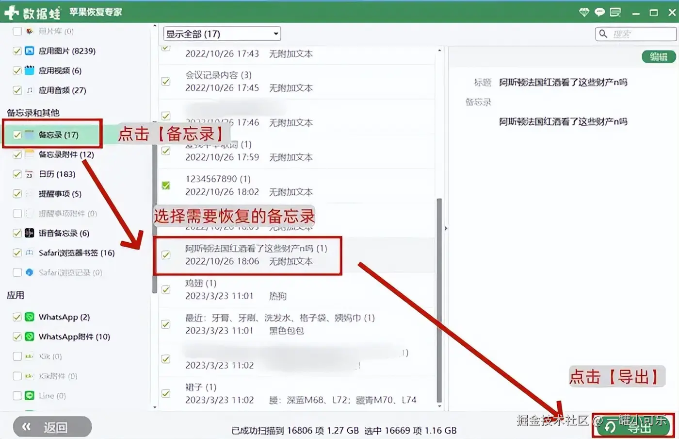 策略第3步:在结果列表中找到并点击 【备忘录】 ,勾选您需要恢复的备忘录,确认无误后,点击 【导出】 按钮。接下来,选择一个安全的存储位置来保存恢复的备忘录数据,然后耐心等待恢复过程完成。