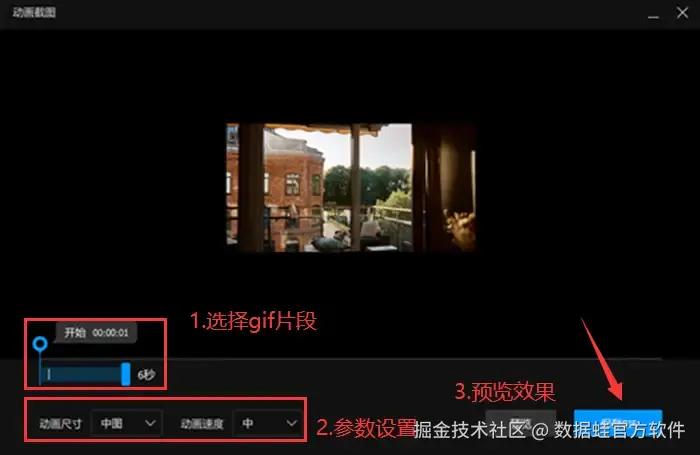 第二步: 通过拖动选择gif图片的长度和内容,可以根据个人需求调整速度等参数。在调整完毕后点击 【预览】 确认效果,确认完毕后点击 【保存gif】 完成转换。