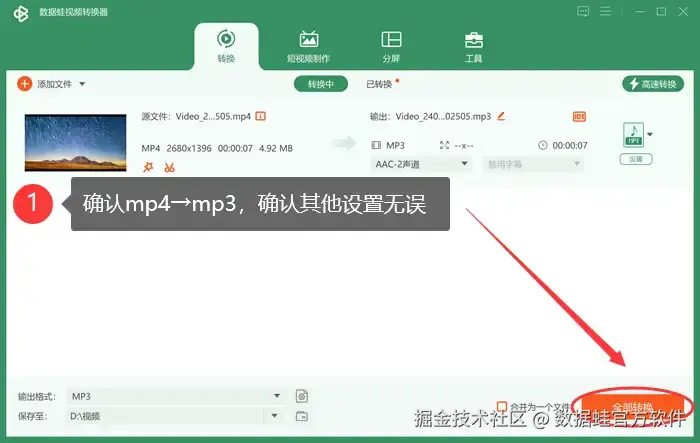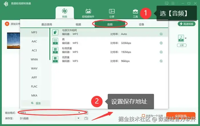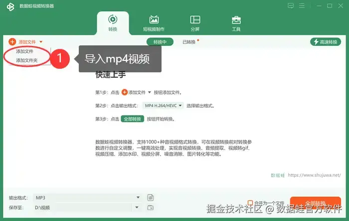如何mp4转换mp3格式?数据 蛙视频转换器是一款优秀的专业转换软件,它转换速度快,转换质量高,能保证音频的无损转换,除了转换外,它还拥有一系列高级音频编辑工具,包括比特率和采样率调整等,允许用户根据个人需求优化音频文件的音质和存储空间。